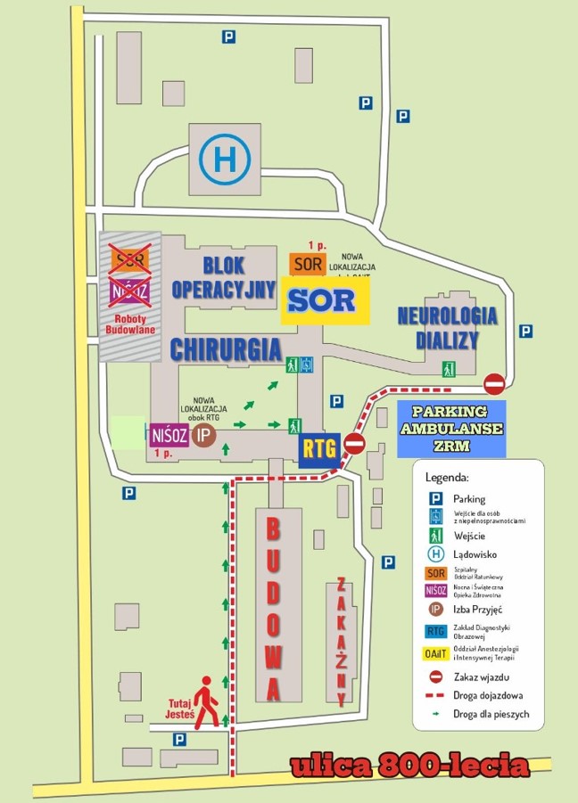 – Wejście do NIŚOZ oraz Izby Przyjęć Planowych (nowej lokalizacji) prowadzi do pomieszczeń pomiędzy Oddziałem Dziecięcym a pracownią RTG – wejście przez dziedziniec szpitala, klatka schodowa i winda od strony Oddziału Kardiologii lub klatka schodowa przy RTG.