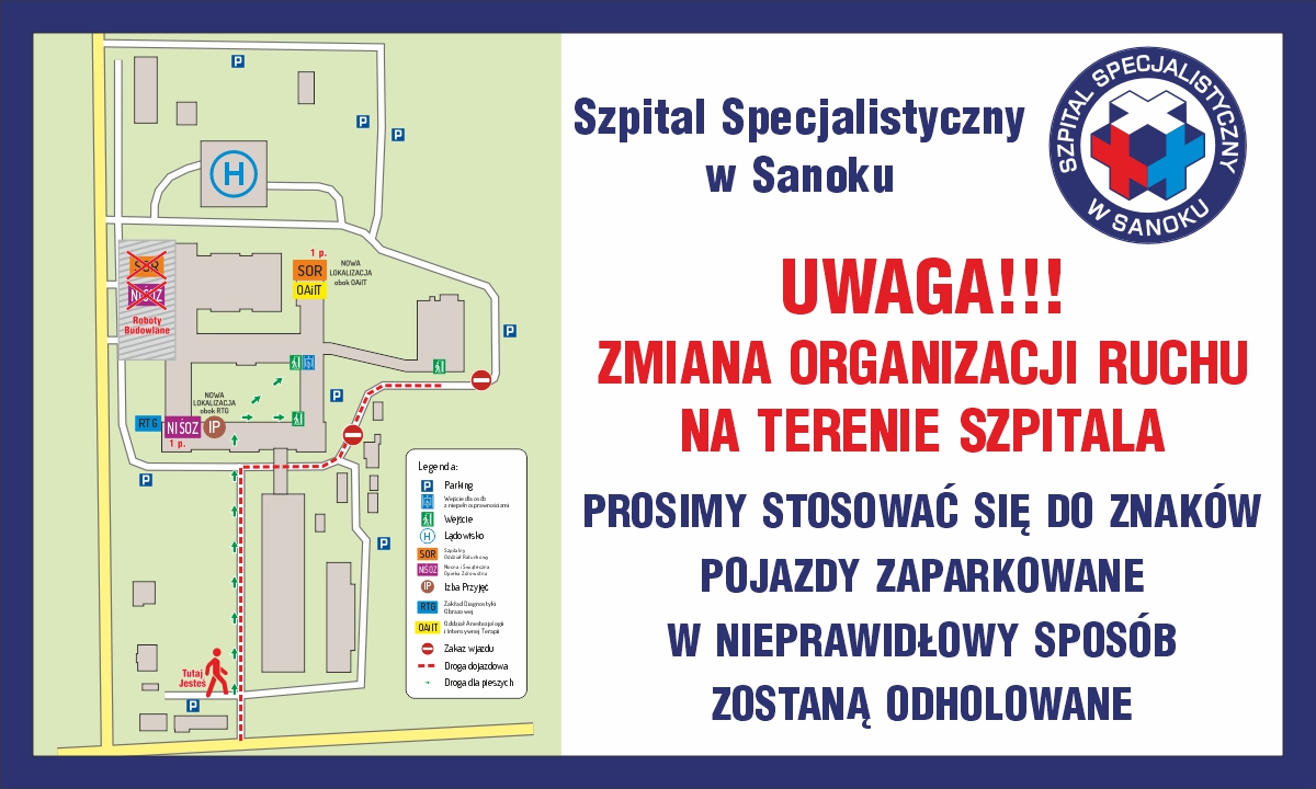 informujemy, że w dniu 2 czerwca 2025 r. Szpitalny Oddział Ratunkowy (SOR), Izba Przyjęć Planowa oraz Nocna i Świąteczna Opieka Zdrowotna (NIŚOZ) w SPZOZ w Sanoku będą przenoszone do tymczasowych lokalizacjach, w których będą funkcjonowały ok 6 miesięcy (w związku z rozpoczęciem przebudowy Szpitalnego Oddziału Ratunkowego).