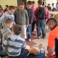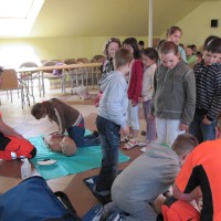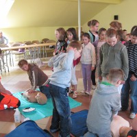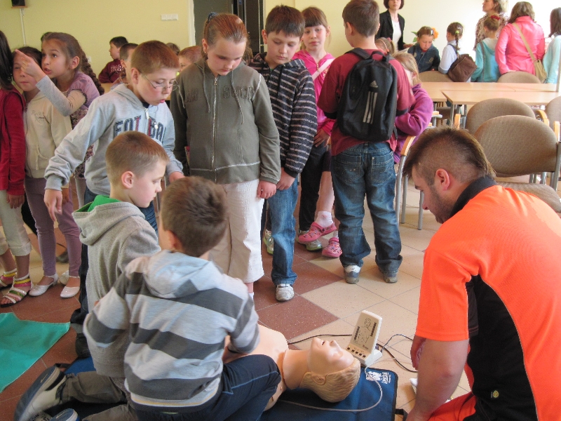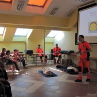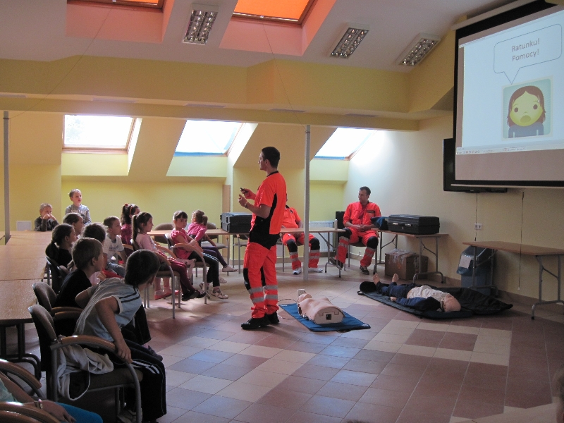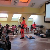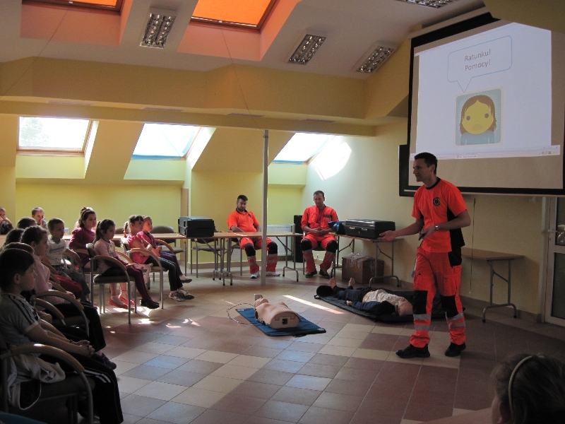 Po wykładzie dzieci miały okazję przećwiczyć praktyczne umiejętności prowadzenia masażu serca i sztucznego oddychania na fantomach pod okiem ratowników medycznych, oglądnęły również ambulanse medyczne oraz sprzęt służący do ratowania zdrowia i życia. Szkolenie przeprowadzili ratownicy medyczni: Marcin Wojcieszak, Tomasz Florczak, Łukasz Gawroński, Tomasz Kafara