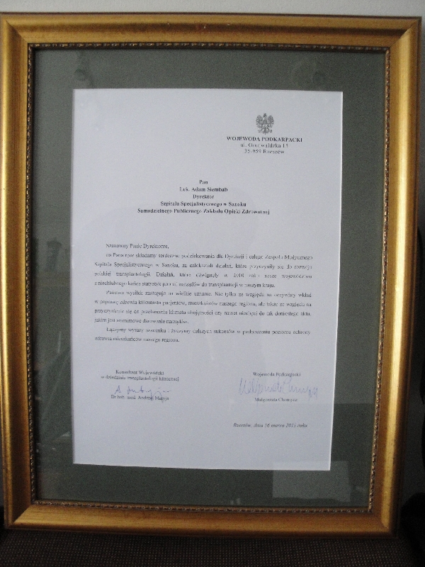 Dnia 16.03.2011 r. podczas zorganizowanej w Rzeszowie I Otwartej Konferencji „Przeszczep szansą na drugie życie” szpital nasz został wyróżniony przez Wojewodę Podkarpackiego Małgorzatę Chomycz za zaangażowanie i skuteczność w propagowaniu oraz rozwijaniu transplantologii na terenie województwa podkarpackiego. Razem z sanockim szpitalem wyróżniony został Szpital Wojewódzki Nr 2 w Rzeszowie i Szpital Wojskowy w Przemyślu. Uznanie władz wojewódzkich zyskała wieloletnia, owocna praca dr Wiesława Gucwy – Ordynatora Oddziału Intensywnej Terapii w Sanoku – oraz kierowanego przez niego zespołu medycznego (lekarze-specjaliści orzekający o śmierci mózgu, pielęgniarki anestezjologiczne, Pielęgniarka Oddziałowa Barbara Bindas, diagności, kierownicy pracowni diagnostycznych – mgr Małgorzata Lipka, mgr Ryszard Prosiecki). W 2010 r. w Sanoku pobrano narządy do przeszczepów od trzech pacjentów. Szpital ściśle współpracuje z Ogólnopolskim Centrum Organizacyjno-Koordynacyjnym ds. Transplantacji „Poltransplant” w Warszawie oraz klinikami transplantologicznymi w Krakowie, Warszawie i Zabrzu.