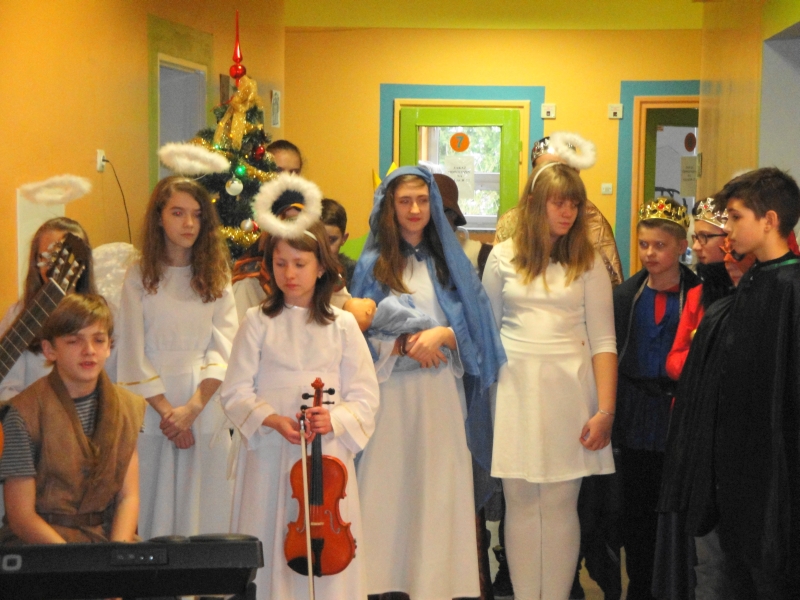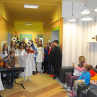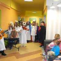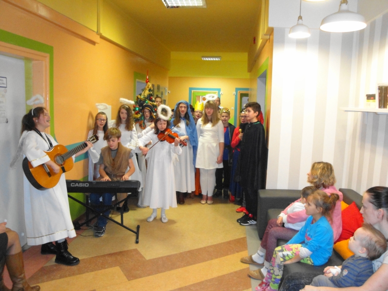 Na prowizorycznej scenie, w którą przemienił się korytarz Oddziału Dziecięcego, zabrzmiały najpiękniejsze kolędy i rozegrało się misterium narodzin Dzieciątka Jezus. Młodzi aktorzy włożyli w przedstawienie wiele serca i wysiłku, budząc ciekawość i zainteresowanie u chorych dzieci.